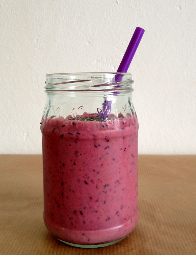 Nu ligt de markt vol met bakken frambozen, bramen en bessen. Als je deze smoothie buiten de seizoenen om maakt, kun je ook diepvriesfruit nemen. Een stuk goedkoper en dan is je smoothie meteen lekker koud. Pureer alles met de staafmixer of in de blender. Serveer met een leuk rietje en een lepel chiazaad, lijnzaad of hennepzaad (of alle drie voor extra power). Lekker als ontbijt of gezond tussendoortje.