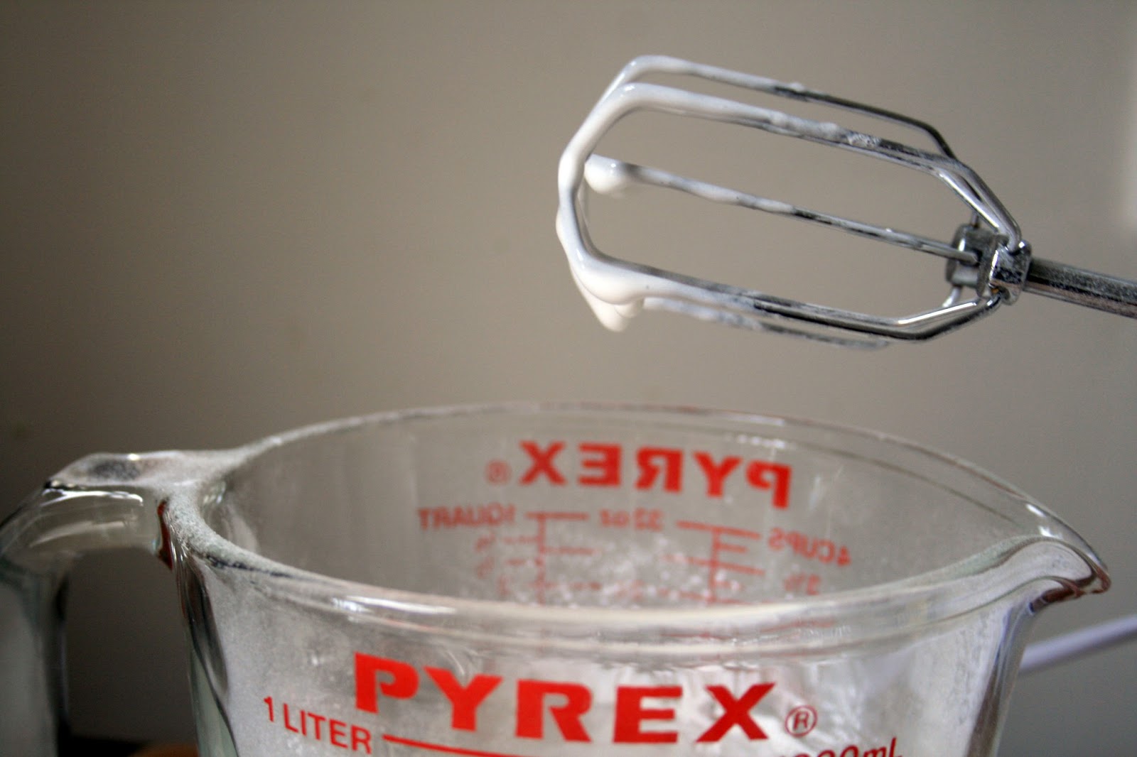 Doe het eiwit in een schone mengkom. Voeg het citroensap toe. Mix het eiwit op de hoogste stand van de mixer stijf.