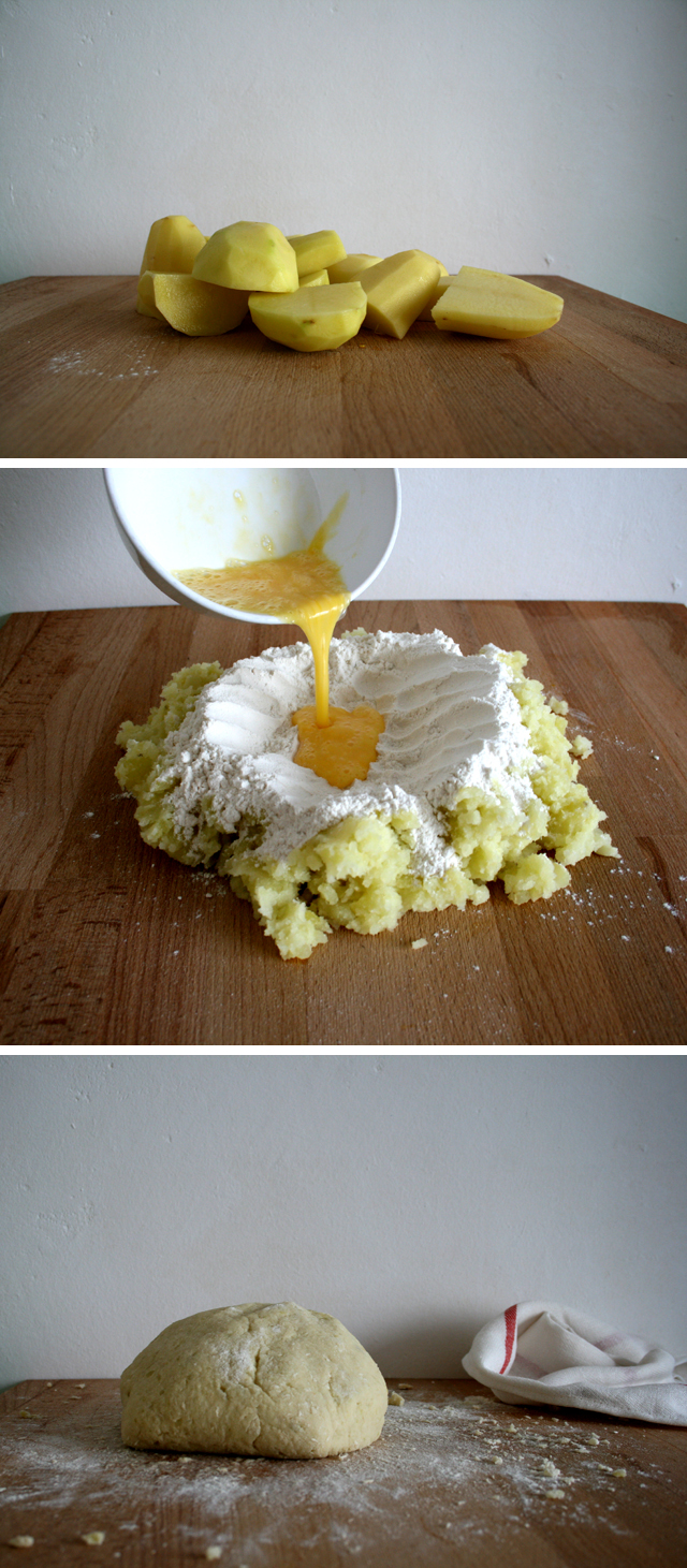 Op het gebied van gnocchi was ik tot op heden behoorlijk onervaren. Neem nou de uitspraak. Met mijn 'gnotshi' dacht ik altijd redelijk Italiaans uit de hoek te komen (die ober in Toscane zal wel gedacht hebben...), maar je spreekt het uit als 'njoki' (dus nee, ook niet als 'gnokki'). Ook mijn verdere gnocchi-ervaringen zijn minimaal. Ik heb ze wel eens kant-en-klaar bij de supermarkt gehaald. Ook op tv heb ik een keer een uitgebreide 'zo-maak-je-gnocchi-documentaire' voorbij zien komen (wat er overigens altijd erg spectaculair uit zag), maar in real life had ik ze nog nooit gemaakt. Dit recept leek me dus wel een uitdaging.