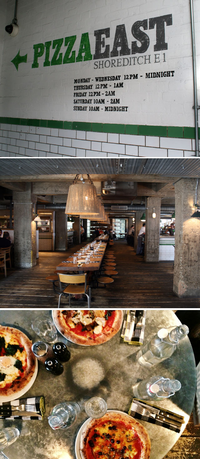 Om de hoek zit Pizza East. Hier hebben we ons laatste avondmaal gegeten: PIZZA! Het restaurant is een industriële ruimte met veel tafeltjes en een open keuken. Ze hebben heerlijke pizza's. Alles is vers en zelfs het vlees wordt ter plekke afgesneden. De pizzaboy raadde ons deze pizza's aan en ze waren heerlijk: pizza met varkensbuikspek en pizza met spinazie, taleggio en ei. Ideaal voor een snelle en lekkere pizza als je voor vertrek niet zoveel tijd hebt.