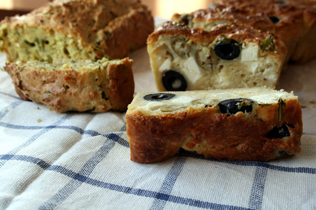 De ene cake is met rucola en pijnboompitten en de ander met feta en olijven. Beide heel anders. De eerste kruimelig en kruidig en de ander zompig.