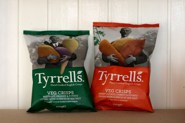 Groentechips. Tyrrells heeft naast hun al bestaande fancy smaken sinds kort een nieuw soort chips in het assortiment: groentechips. Voor degenen die zich te chique voelen voor aardappelchips heeft Tyrrells iets nieuws bedacht: chips van knollige groentes. Voor de echte fijnproever. Ze hebben twee soorten: de groene zak is groentechips van bieten, pastinaak en aardappel. Excelent with an elderflower cordial. In de oranje zak vind je chips gemaakt van zoete aardappel, wortel en aardappel. Deze variant is lovely with lemonade.