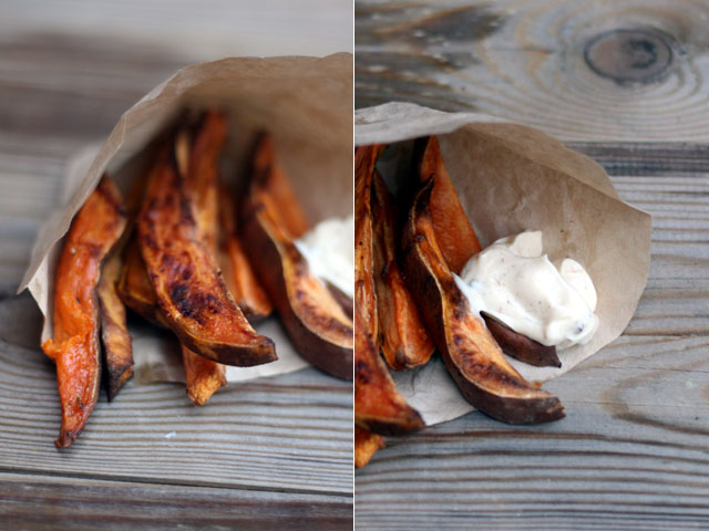 Verwarm de oven voor op 200 graden. Laat de schil om de zoete aardappel. Snijd een stukje van de boven- en onderkant. Snijd de aardappel eerst in de lengte door midden of als je een hele dikke hebt in 3 stukken. Snijd in de lengte in frieten van ongeveer 1 centimeter dik. Bekleed een bakplaat met bakpapier. Verdeel de frieten over de bakplaat en bestrooi royaal met zeezout. Sprenkel er wat olijfolie over. Zet in de oven. Keer de frieten na 25 minuten om en bak dan nog 10 minuten. Eet ze met komijnmayonaise of truffelmayonaise.