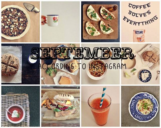 In september was havermout back on track. Om de kou 's ochtends te trotseren at ik dapper mijn kom met warme sticky dadel oats en havermout met banaan uit de oven | Ook favoriet ontbijt was Griekse yoghurt met amandelen, hazelnoten, dadels, vijgen en honing | In september probeerde ik fusion smoothies met groenten. Tegen alle verwachtingen is een smoothie met wortel of spinazie echt lekker en goed voor de weerstand | In september had ik het koud, verregende ik en waaide ik van mijn fiets. Wetende dat er thuis comfort food staat te wachten. Herfstwraps met brie en paddenstoelen, risotto met knapperige chorizo en tatin van aubergine met zandkoekdeeg | In september at ik weer heel veel soep. Soep is herfst en herfst is soep | In september bakte ik eindelijk voor het eerst zelf brood. Een brood met rozijnen en vijgen en een Iers sodabrood (zonder kneden!) | Is september bietenmaand? Ik at in ieder geval opvallend veel bieten: bietensoep, haring bietentartaar en bietenburgers | In september maakte ik een epic meal: burgers van bieten met avocado en mango op zuurdesembrood | In de nog donkere septemberochtenden had ik mijn geliefde espresso extra nodig. Ik hing zelfs een wordbanner op. Ode aan koffie |